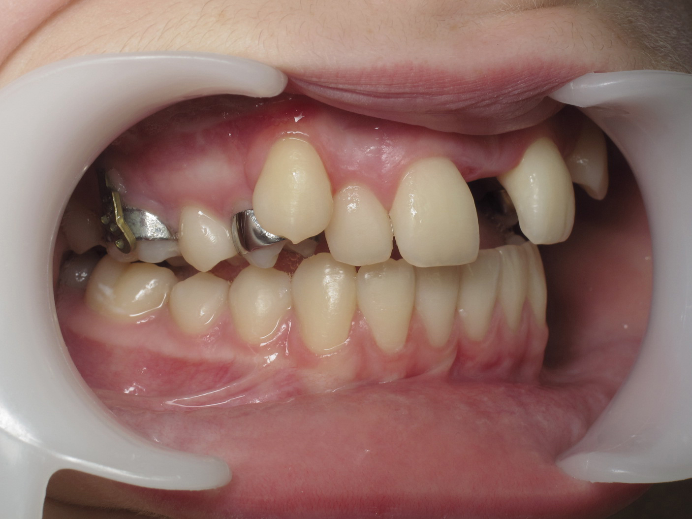 Au maxillaire, les 16.26 sont baguées, les 14.24 collées. Un Optimax Distaler est installé de chaque côté sur ces supports orthodontiques.